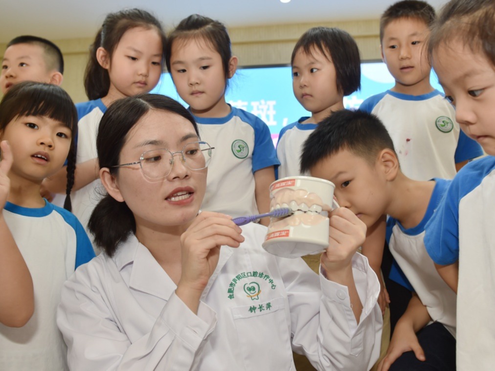 2025年9月17日,在合肥市宿州路幼儿园,庐阳区口腔诊疗中心医生为小朋友演示正确刷牙方法。当日,合肥市宿州路幼儿园联合庐阳区口腔诊疗中心开展“口腔健康 全身健康”爱牙护牙主题宣...