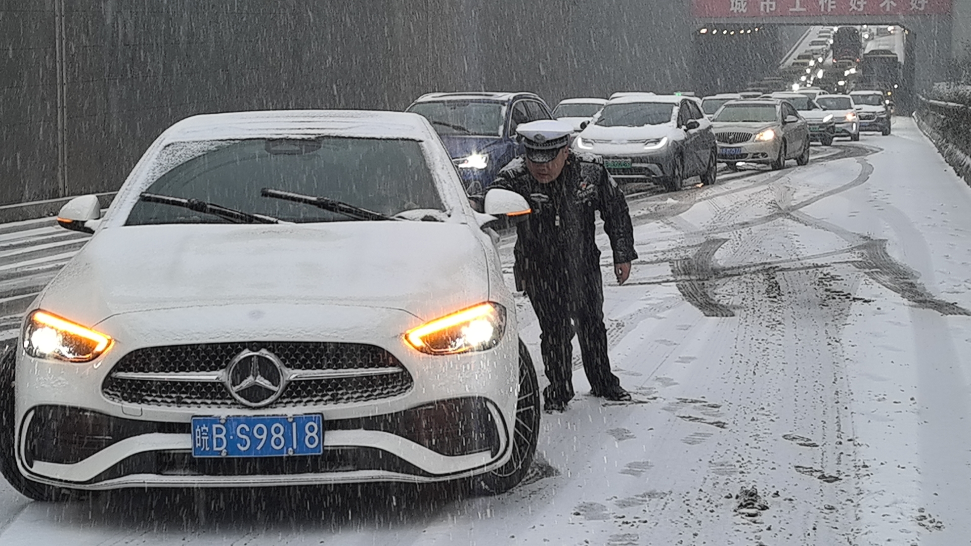 1月20日,芜湖市突降大雪,辖区部分路段因积雪结冰出现车辆拥堵。