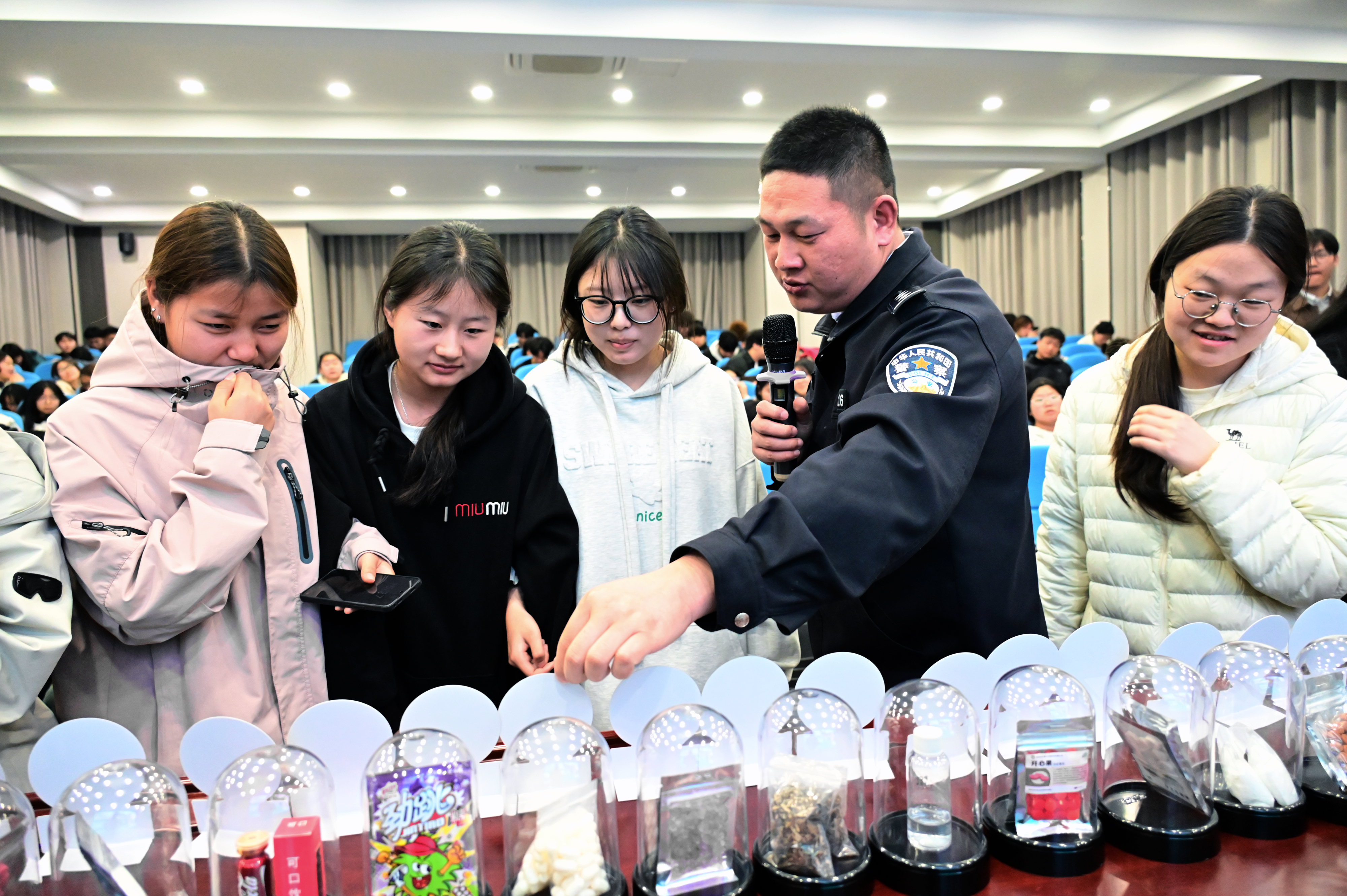4月8日,固镇县公安局民警来到位于固镇县的蚌埠经济技术职业学院,为同学们讲解国家禁毒史、展示仿真毒品样本、播放禁毒宣传片,提升学生识毒、防毒、拒毒能力。(吴献永)