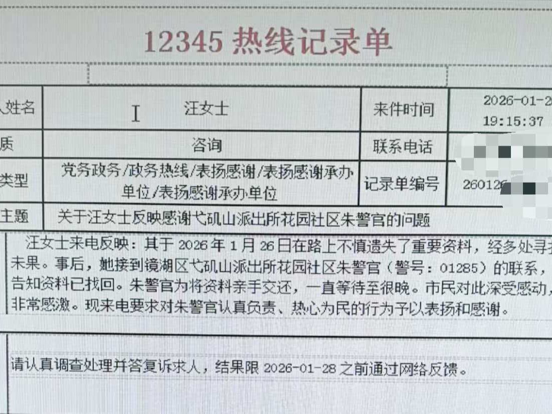 本网讯(记者李斐通讯员张红张奇)“特别感谢弋矶山派出所花园社区的朱成木警官,帮我找回了重要物品,还耐心等我取件,太暖心了!”1月27日,芜湖市公安局镜湖分局弋矶山派出所收到一件12...