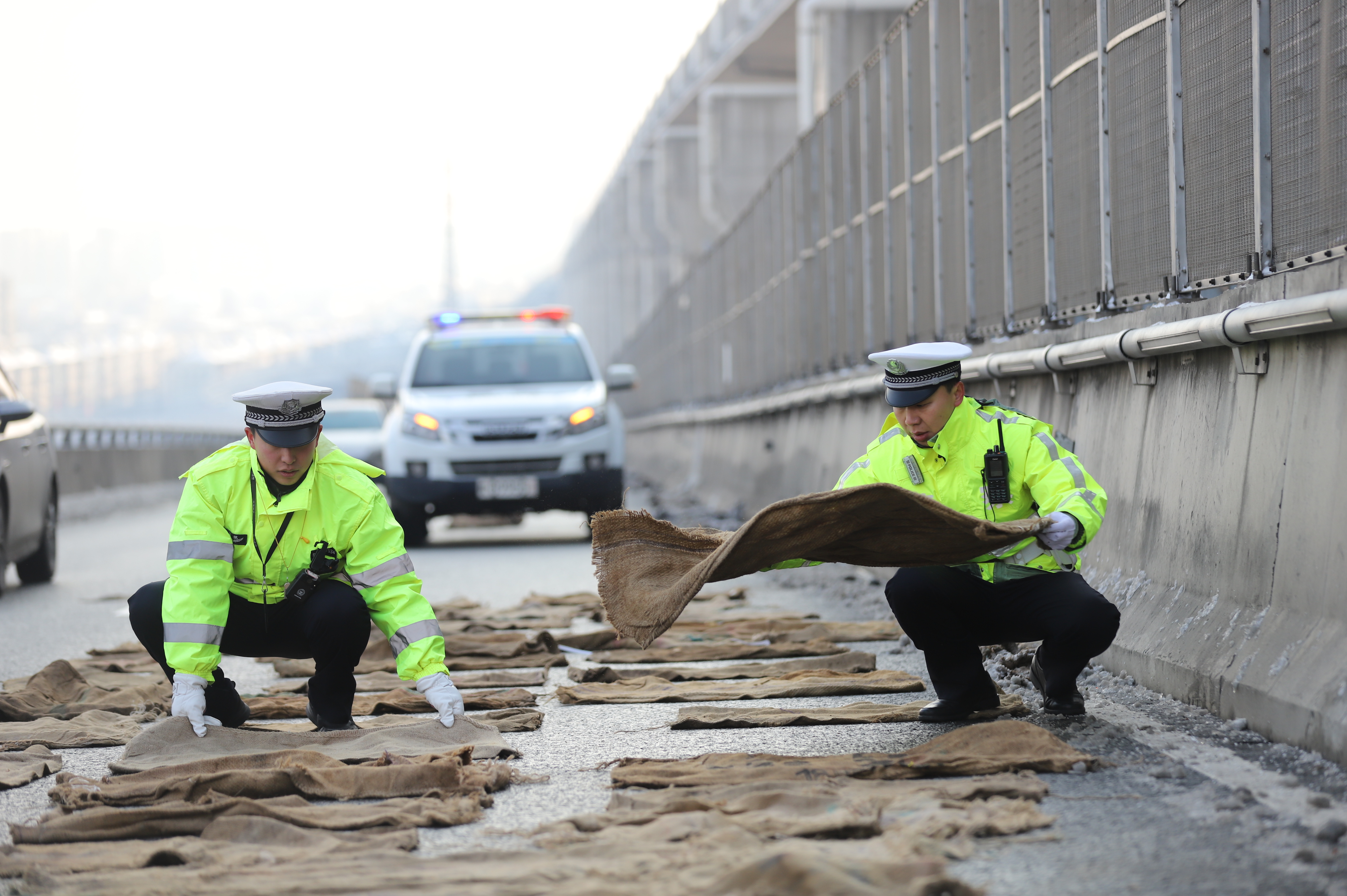 1月21日,受低温寒潮降雪天气影响,芜湖市长江三桥部分路面出现结冰现象,该市公安局交管支队江北大队民警辅警24小时坚守,在易滑路面抛洒融雪剂、铺上防滑麻袋,并协助公路养护人员及时清...