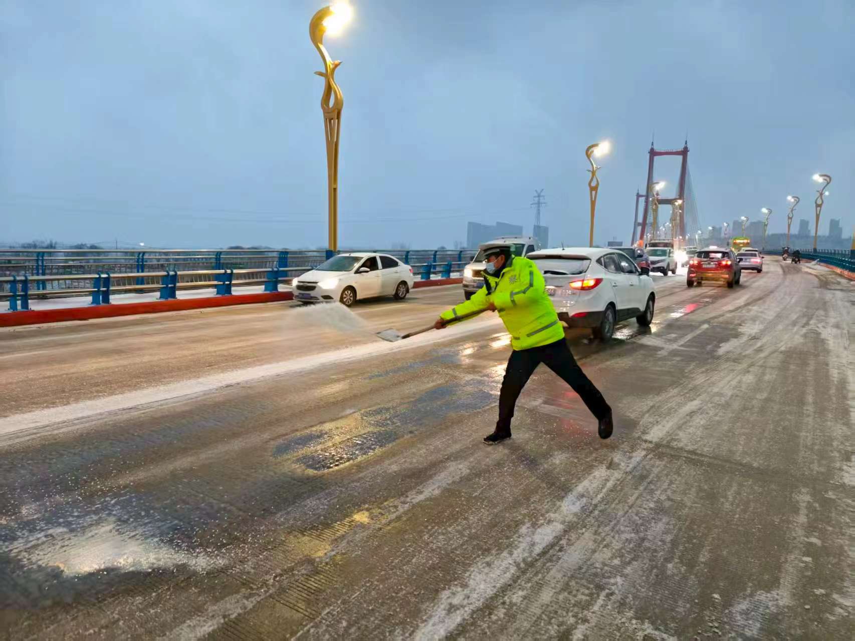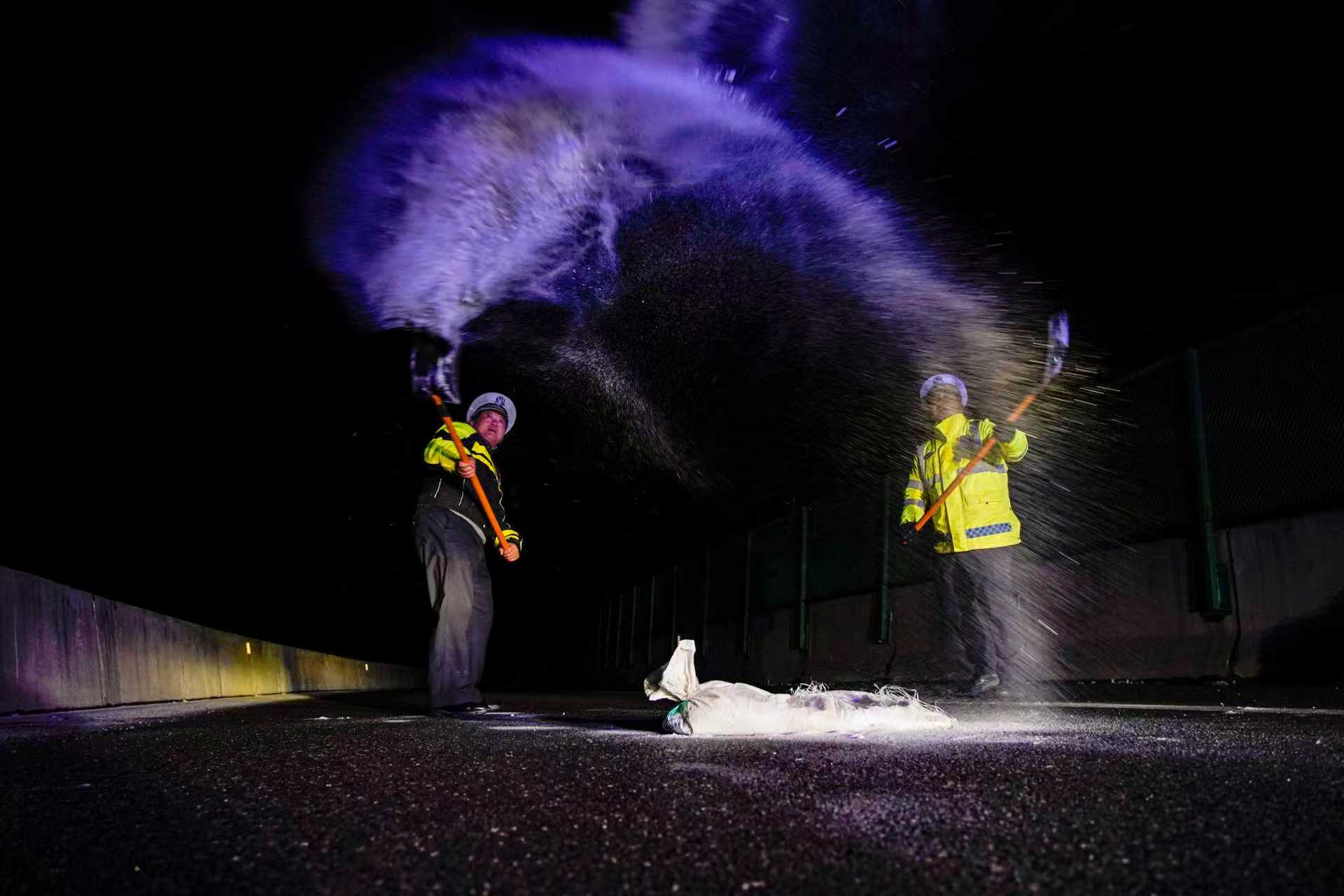 1月19日晚,和县公安局交管大队组织警力在辖区国道347线濮集枢纽撒盐除冰。