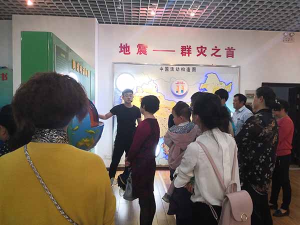 ▲宿州市地震局在宿州市地震科普馆接待社区群众参观