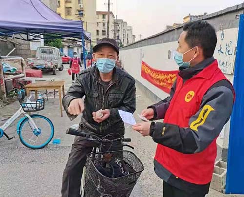 4月20日,区纪委监委机关党员志愿者在团结路菜场值守点参加疫情防控志愿服务。