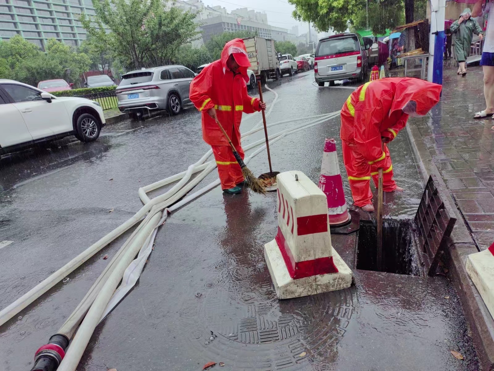 环卫部门则提前对垃圾中转站等环卫设施设备用电、房屋安全和消防安全进行全方位排查;对环卫作业车辆进行全面检修,保证作业车辆正常运行。安排环卫人员雨中不间断巡查,做好重点路段排水、清淤。对交通枢纽及主次干道开展积水推扫工作,及时打开沿路堵塞雨水箅子加速排水,并清理排水口周边枯枝、落叶等杂物。在积水点放置安全防护警示装置,提醒过往市民。