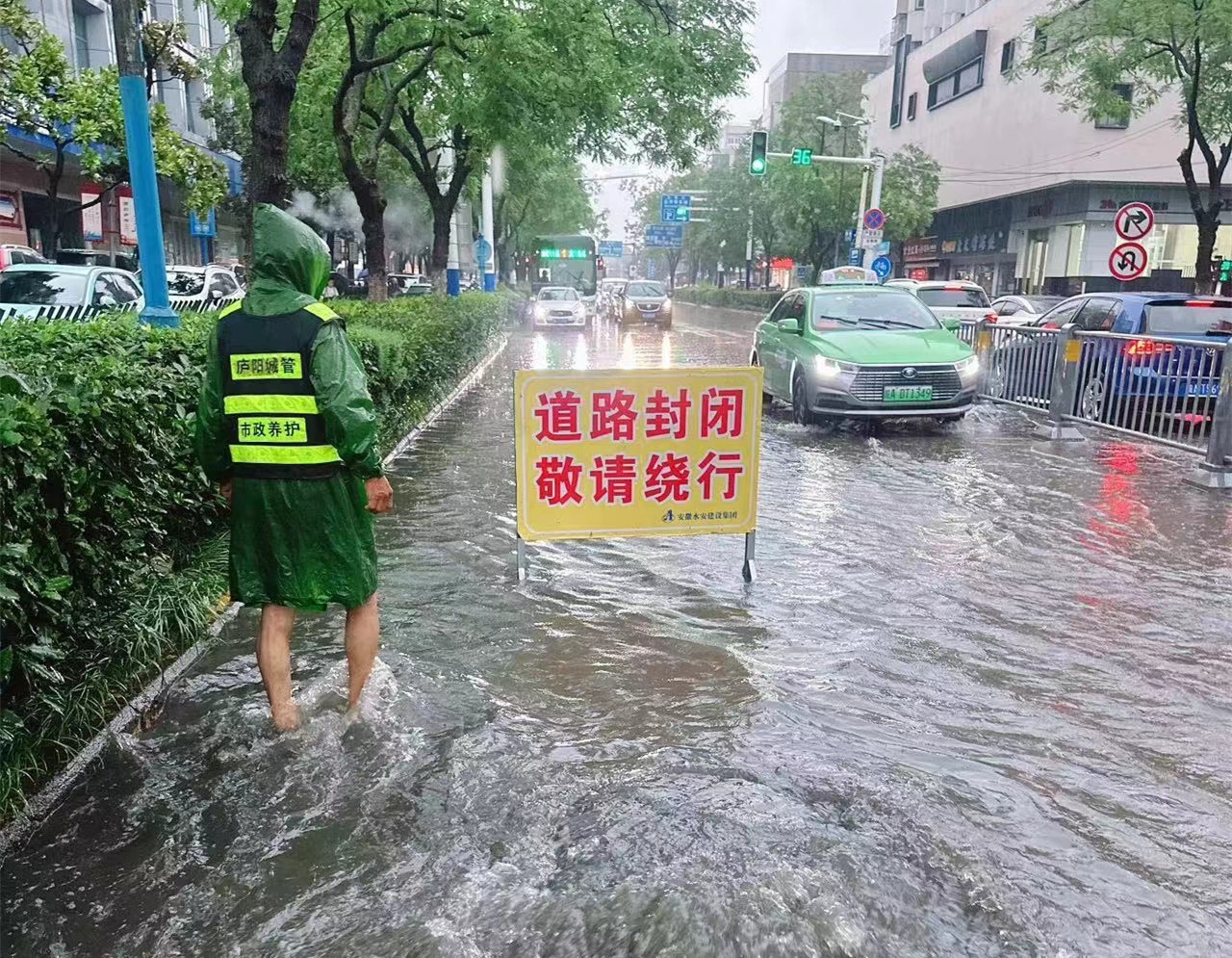 目前,降雨还在继续,庐阳区城管局1500余名应急人员按照包保责任,对全区下穿桥、低洼路段等易积水点进行巡查值守,负责对所包保路段的雨水篦、下水井是否存在破损、缺失,下水是否通畅等问题进行检查,并及时将淤积在排水井篦子周围的落叶、垃圾等进行清除,同时对积水较深路段及时设置禁行标志或安排人员定岗提醒。