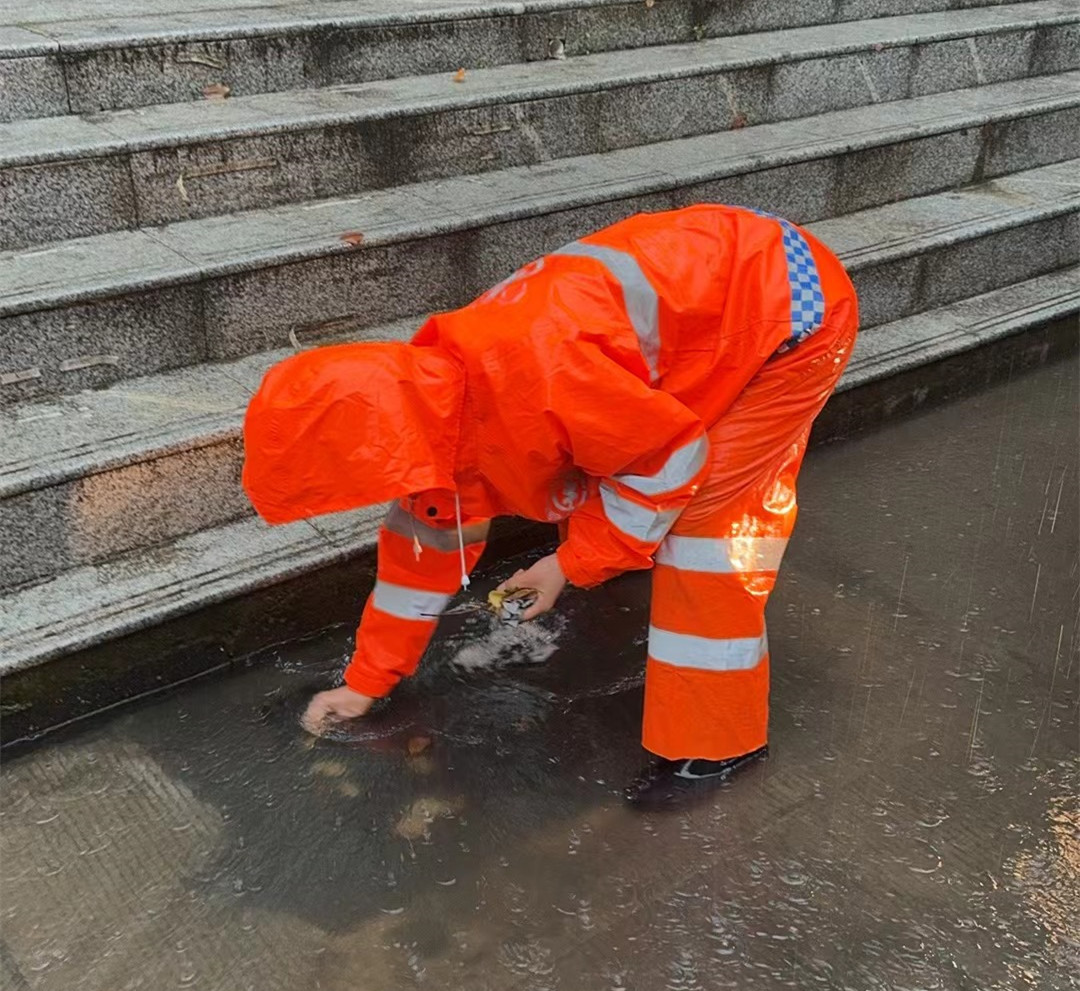 此外界首路、义井路、凤淮路等路段地势较低,属于易积水路段,环卫工人们采取先集中人力处理大片坑洼积水,再分段处理小范围积水的办法,对由于道路低洼等原因造成的积水问题,进行推水作业,保障雨后路面无大面积积水。待雨势减弱后有序开展人工路面巡回保洁,清除淤泥、清扫积水、清理断枝落叶,尽快恢复道路清洁,消除安全隐患。