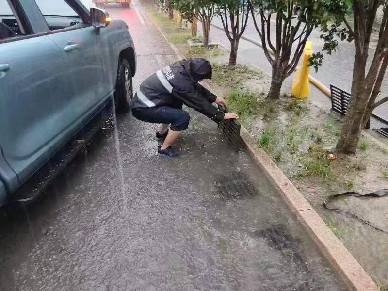 早上6点,庐阳区城管局应急人员提前到岗,着重对涡阳路、农科南路、天水路等下穿桥,以及界首路、肥西路等低洼易积水路段进行雨中值守。7点28分左右雨势正大,肥西路在强降雨下短时间内形成积水路面,漫过了道牙砖,现场,庐阳区城管局局长朱先锋带领执法队员,配合交警立即做好警示措施,并淌入漫到小腿肚的积水中,徒手将垃圾掏出,及时打开排水口,确保排水畅通。