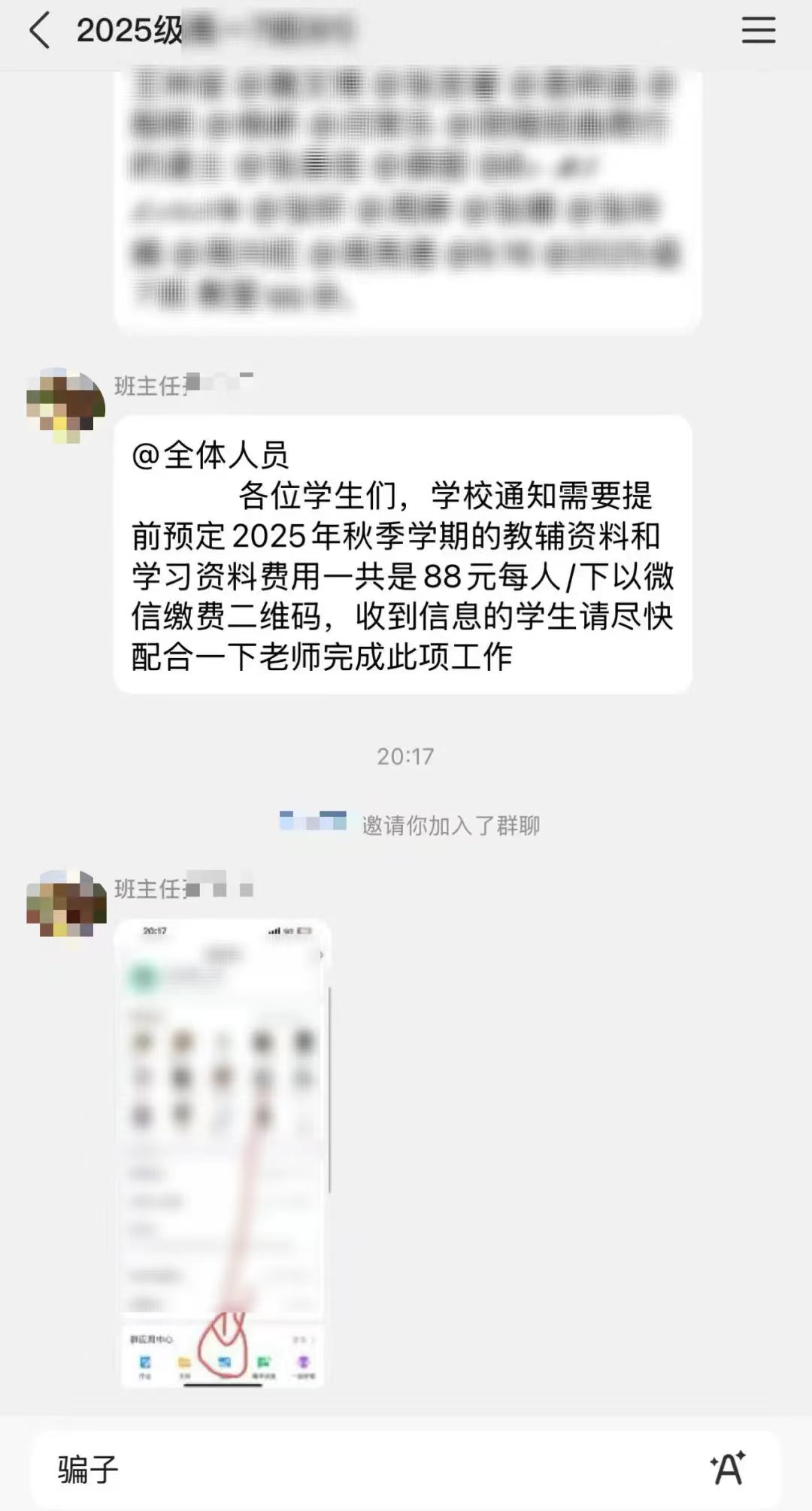 9月11日,合肥市公安局经开分局接到报警,称有人冒充辖区某中学班主任,盗用其头像和昵称,在班级群内发布虚假收费通知,以收取88元“新生资料费”为名并附收款二维码实施诈骗。