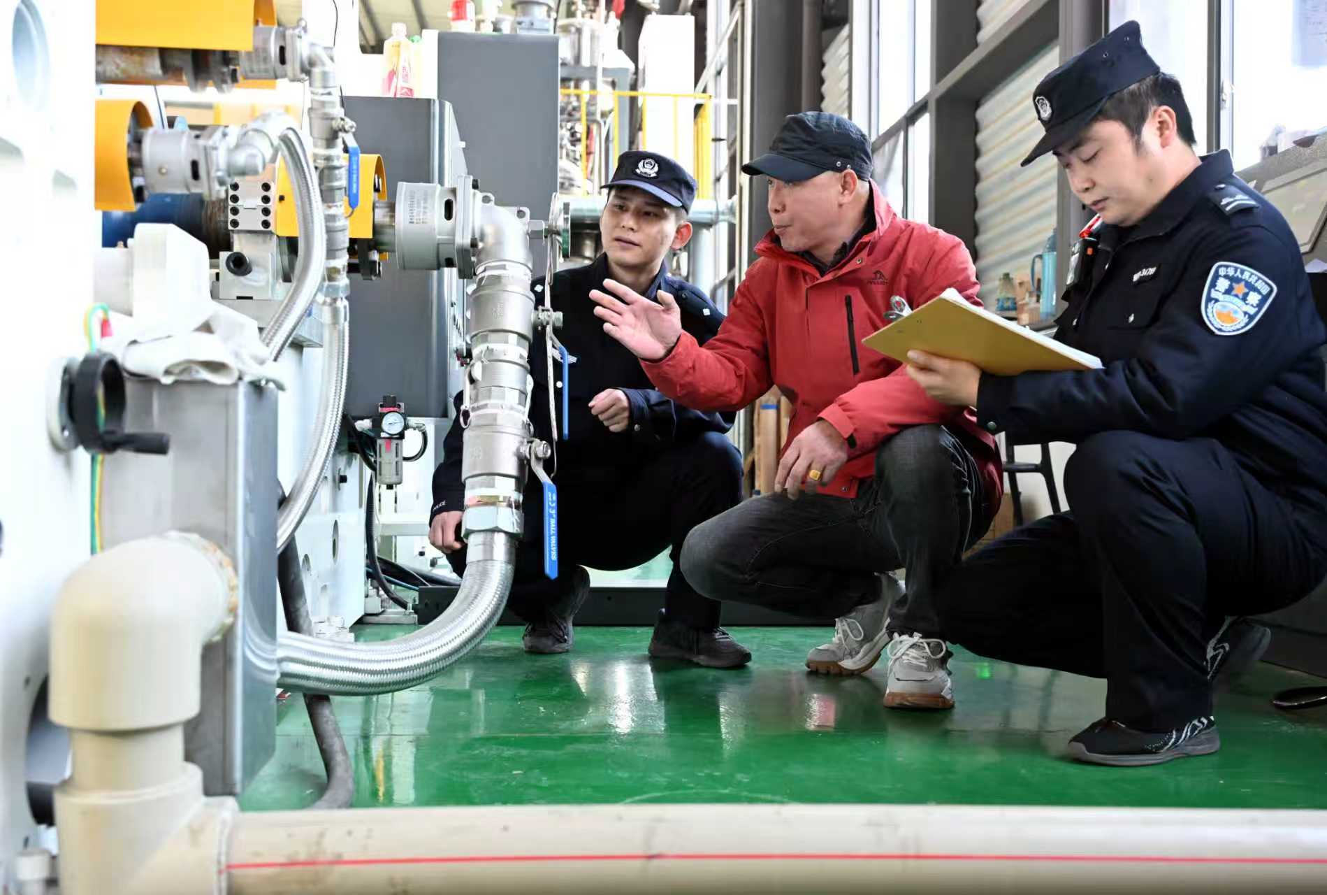 11月18日,当涂县公安局护河派出所组织民警辅警走进辖区企业开展冬季走访活动。期间,民警详细了解企业生产中存在的问题和困难,排查化解涉企矛盾纠纷,开展安全生产检查,旨在进一步消除安全漏洞,护航企业高质量发展。(通讯员 卫学超 记者 李斐 摄)