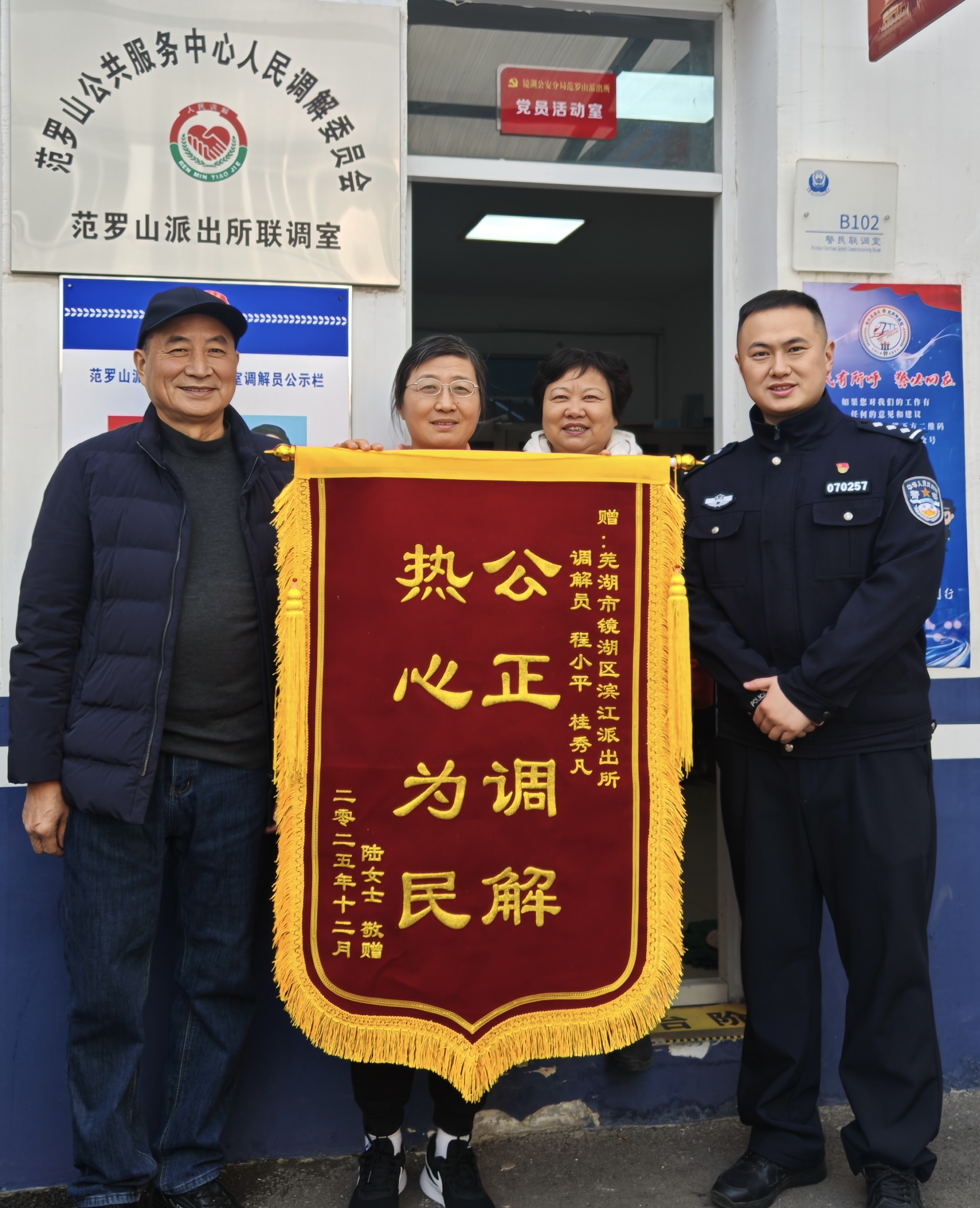 近日,芜湖市公安局镜湖分局范罗山派出所警民联调室,成功调处一起跨越十年的房产继承家族纠纷,让僵持十载的亲情裂痕得以弥合。12月17日,当事人专程送来“为人民办实事 做群众贴心人”锦旗致谢。