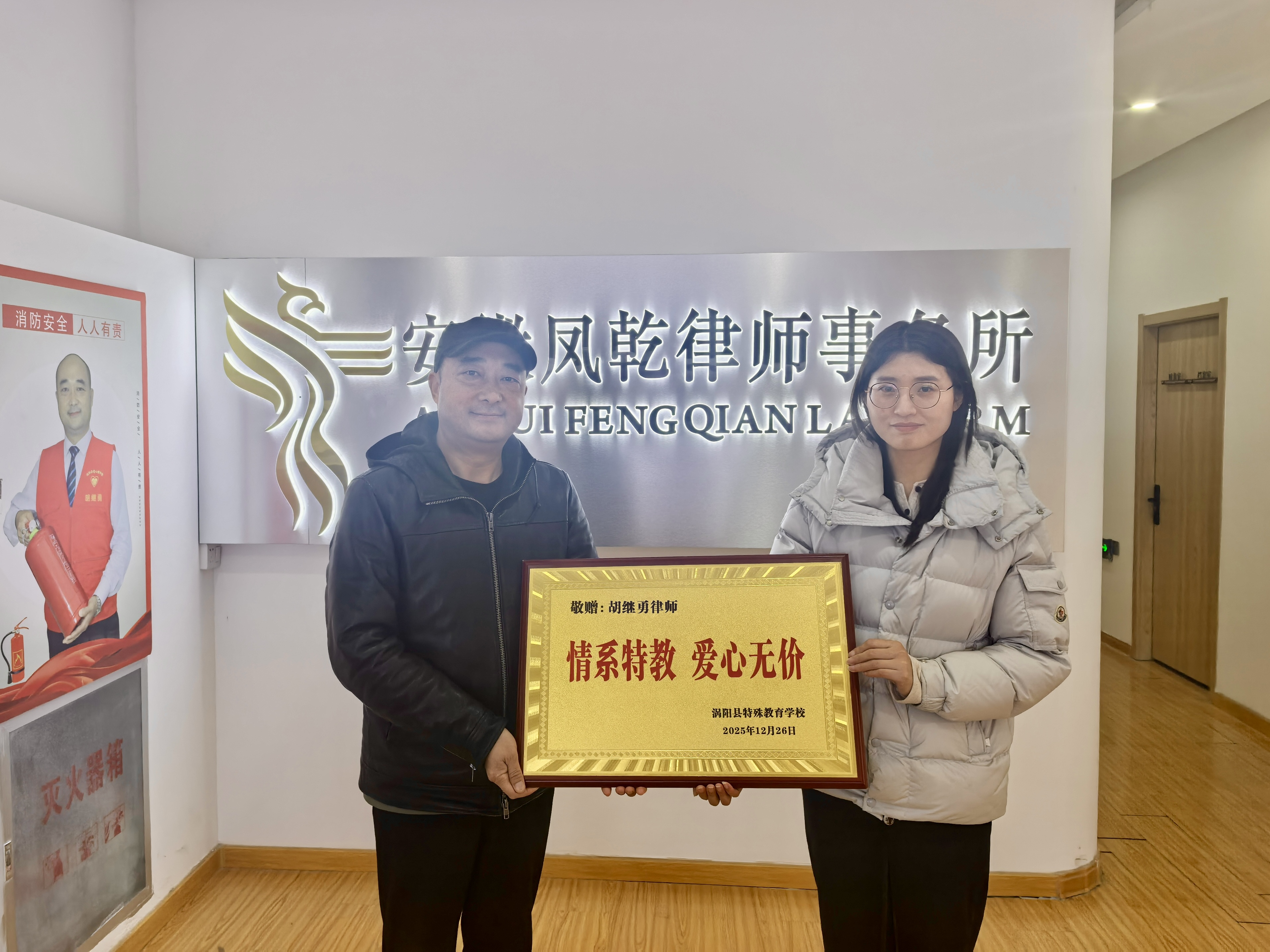 1月4日,涡阳县特殊教育学校将一块烫印“情系特教 爱心无价”的金色牌匾,送到安徽凤乾律师事务所主任、党员律师胡继勇手中,致谢其十余载持续关爱特教儿童的暖心善举。