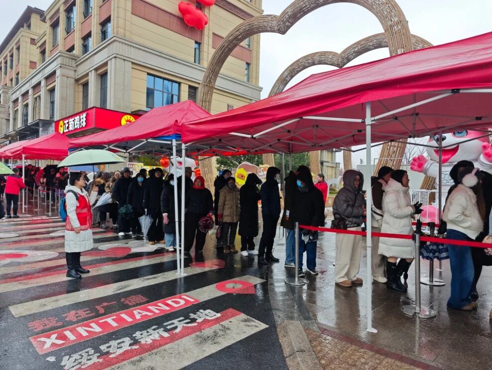 2026年1月1日清晨,细雨如丝,刚结束跨年狂欢的广德街巷尚未完全苏醒,卡旺卡奶茶的果香、詹记桃酥的酥香已悄然弥漫。上午8时许,两家网红门店前,五颜六色的雨伞早已撑起长队,雨雾中,一抹抹“志愿红”穿梭其间,为这份新年的期待增添了别样暖意。志愿者们哈着热气整理手绘地图与美食攻略,提前到岗坚守,等候一波波慕名而来的游客。
