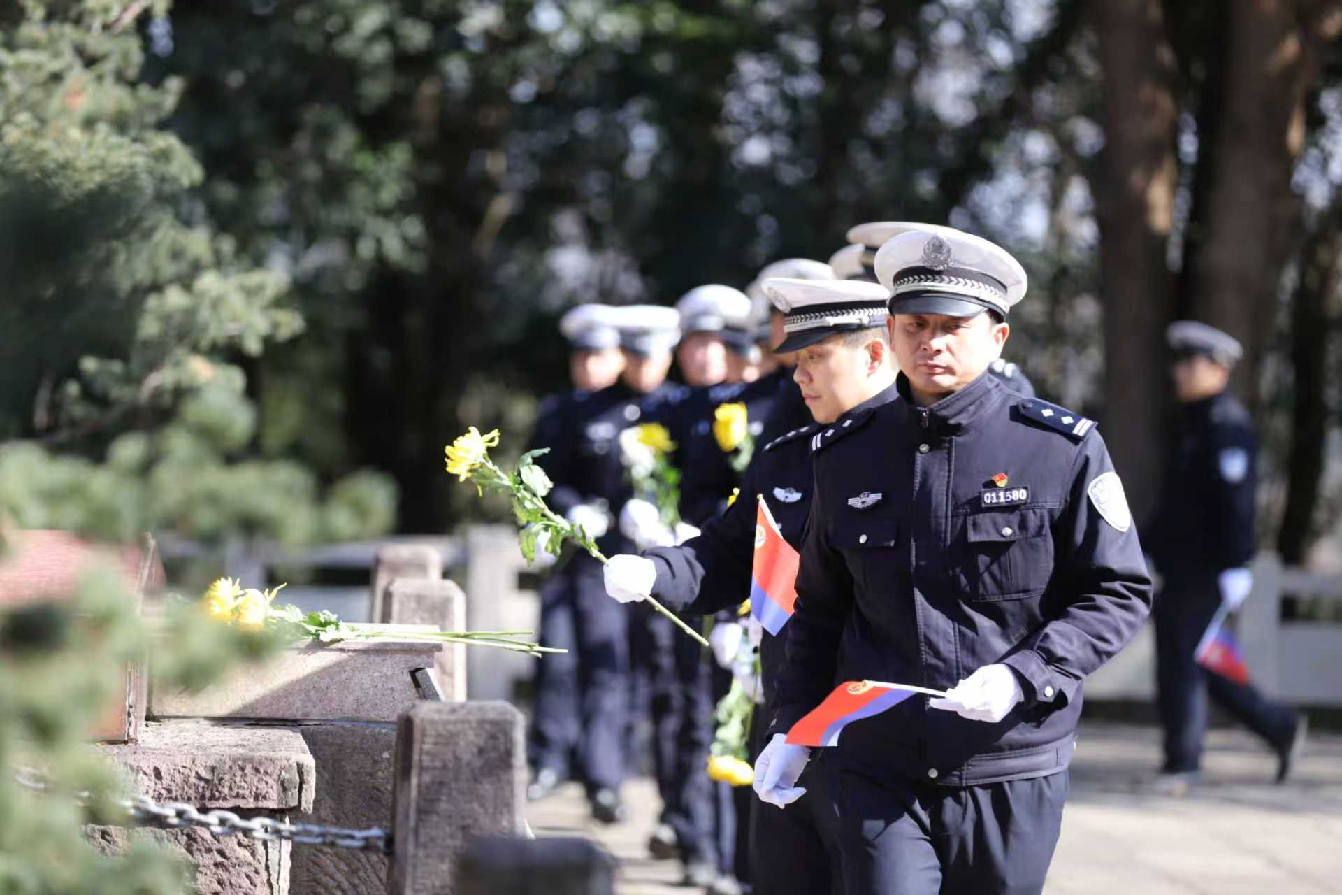 1月7日,在第六个中国人民警察节来临前夕,芜湖市公安局交管支队弋江大队组织民警辅警代表,前往芜湖市烈士陵园,开展“祭英烈 铸警魂”主题活动。民警辅警在巍峨的烈士纪念碑前整齐列队,脱帽肃立,向革命烈士默哀致敬,敬献菊花,重温公安机关人民警察誓词,感悟革命精神,重温红色记忆。
