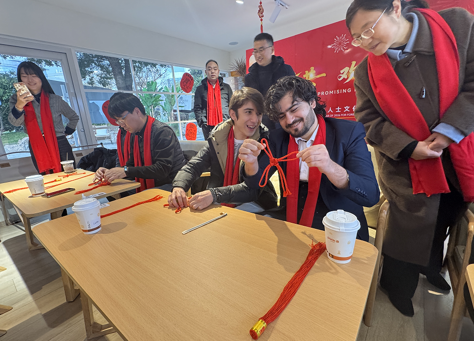 来自塔吉克斯坦的池州学院留学生阿里则格外用心,完成中国结制作后,立刻将这枚红彤彤的中国结挂在自己的衣服上。“挂在身上,就像把新年的好运带在身边!中国结不仅好看,还藏着美好的寓意。”