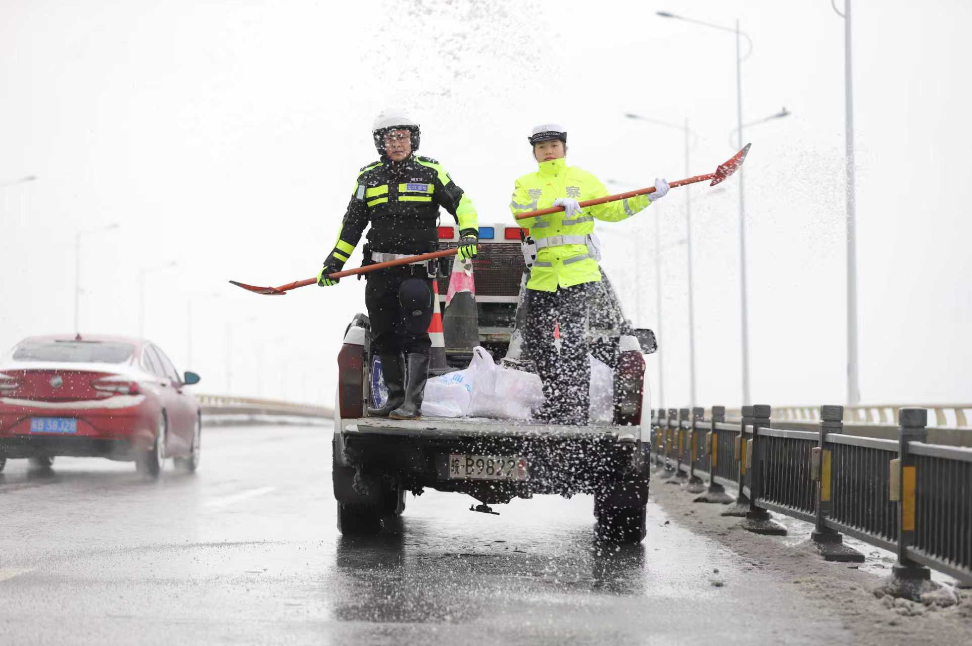 1月20日,芜湖市主城区迎来风雪天气,该市公安局交管支队弋江大队全警上岗,疏导交通,服务市民,做好安全宣传工作,确保辖区道路畅通有序,市民平安出行。