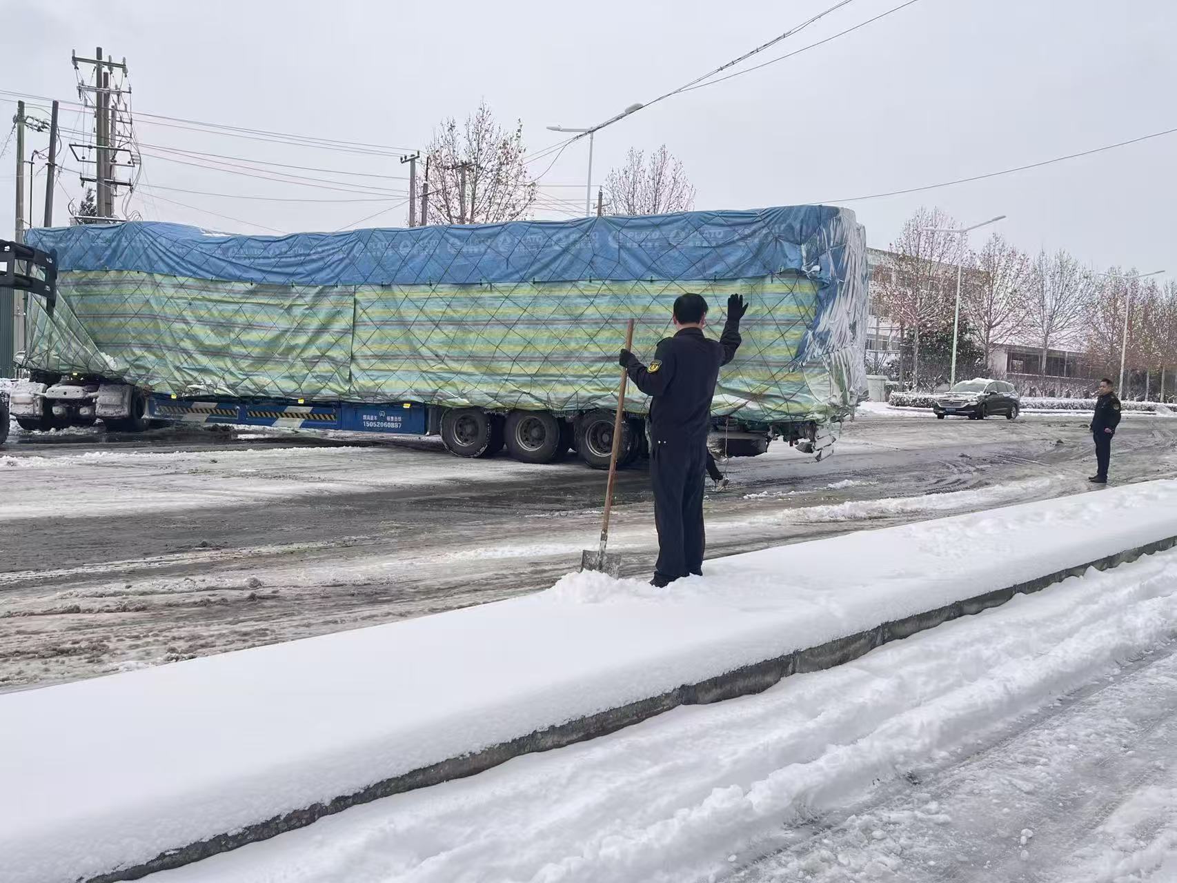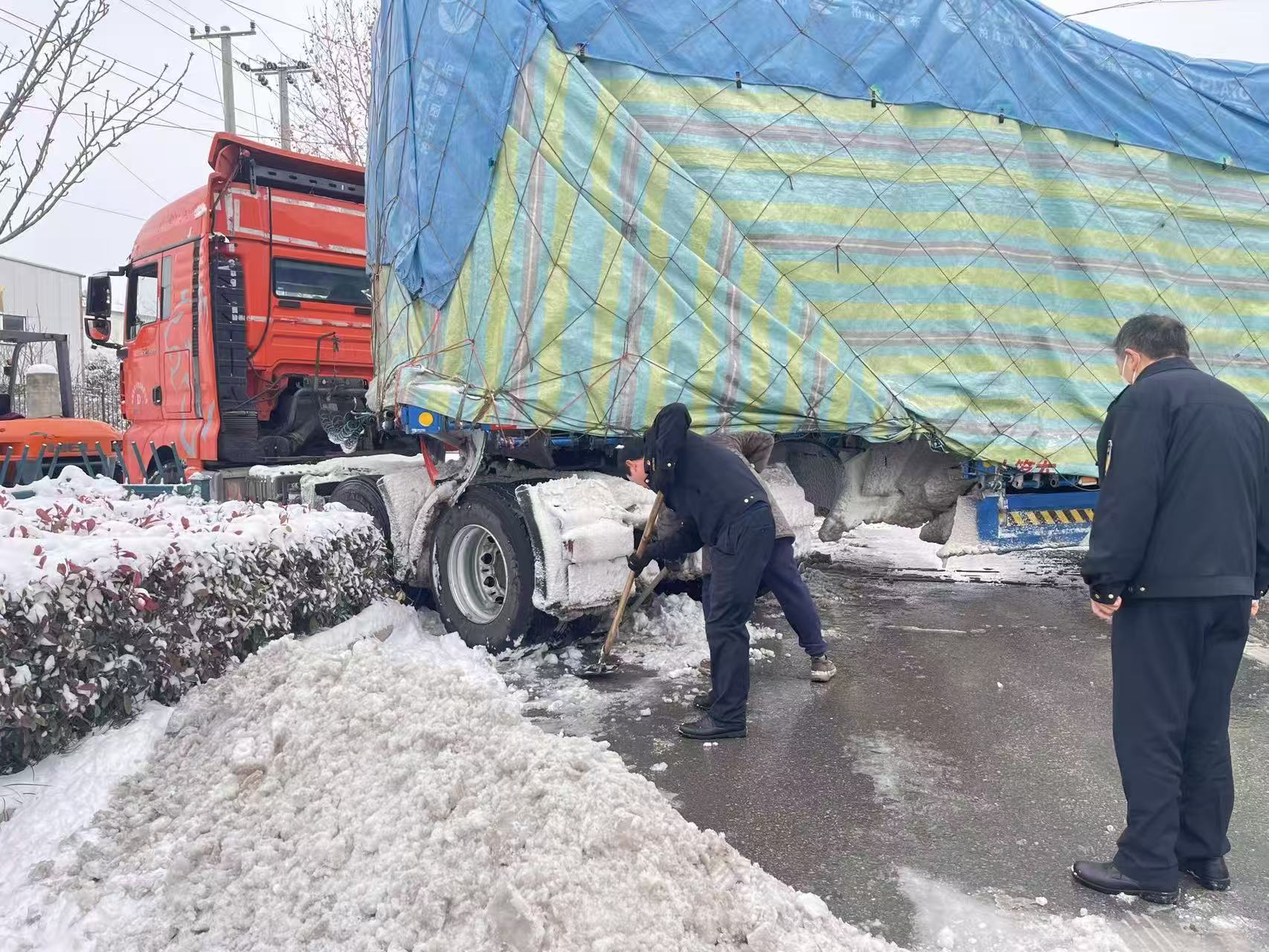 险情当前,执法人员迅速行动:一方面现场指挥疏导,提醒过往车辆减速谨慎通行,筑牢安全防线;另一方面主动协助受困货车司机,手持除雪锹等工具全力清理车辆周边积雪。经过多方协同发力,受困货车成功驶出雪坑,现场道路通行秩序快速恢复,安全隐患彻底排除。