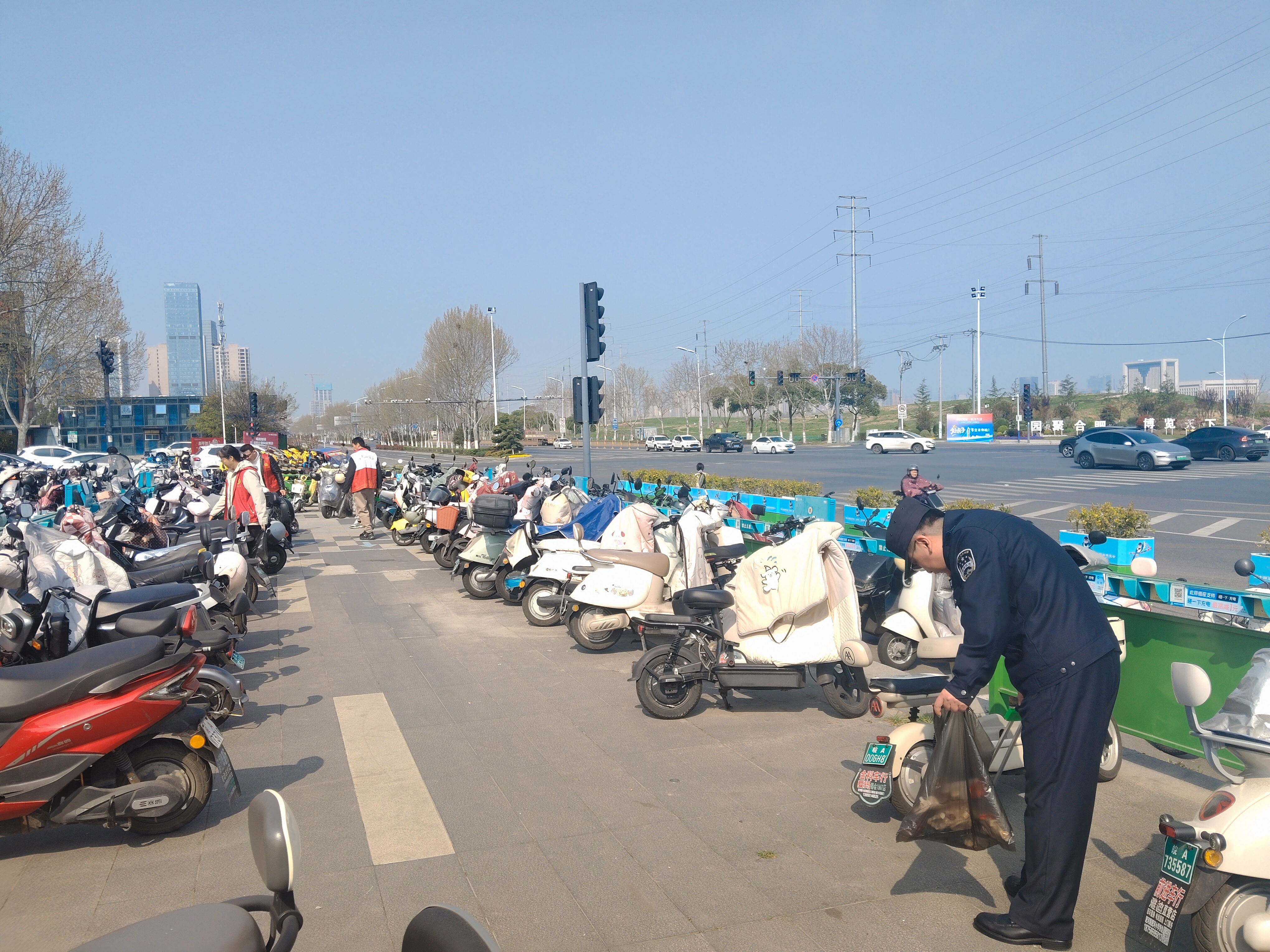 会展中心地铁口周边作为城市形象的“重要窗口”,是此次整治的核心阵地。志愿者们循着主次干道与沿街绿化带,开展“地毯式”排查清理。针对非机动车乱停乱放这一影响通行秩序的顽疾,志愿者们化身“文明传声者”,以温润耐心的话语向过往市民宣讲规范停放的重要意义,引导文明骑行新风尚;同时亲手将歪倒、占道的电动车、自行车一一扶正归位,规整排列于指定区域,让通行脉络重归畅通有序,为城市肌理注入规整之美。