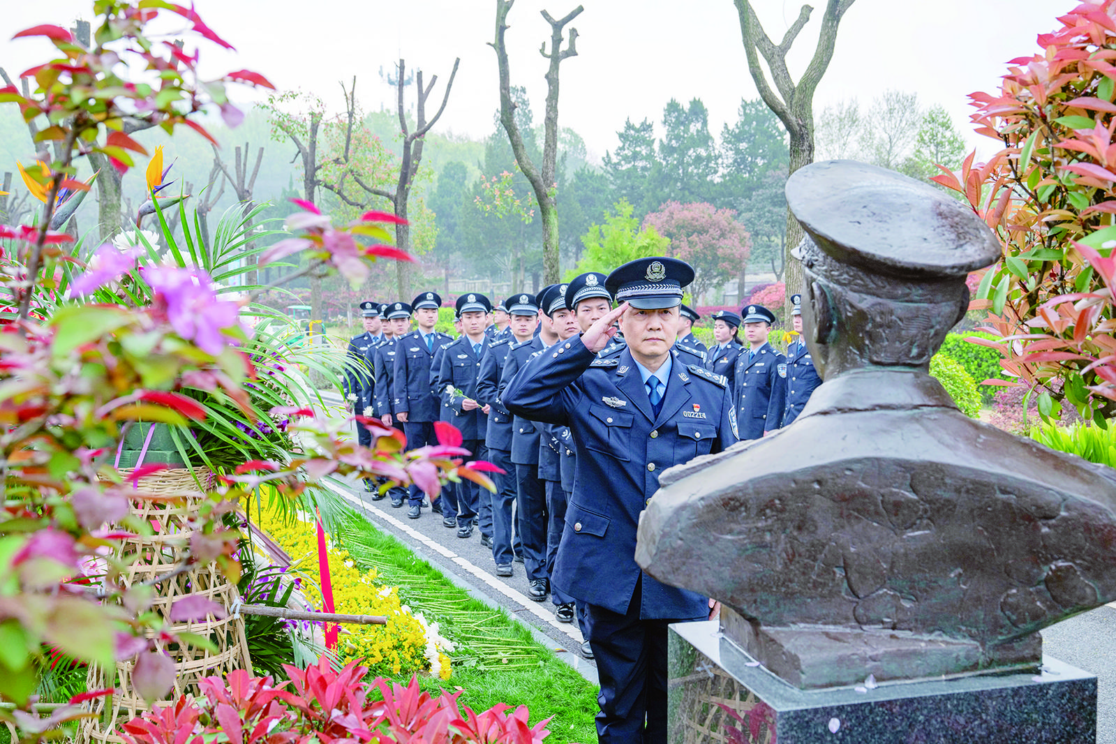 4月1日,合肥大蜀山文化陵园,薄雾如纱,松柏静立,11座合肥公安英烈铜像巍然矗立。当天上午,合肥市公安局举行清明祭英烈活动,110名民警代表列队肃立,向长眠于此的公安英烈致以最深切的缅怀与最崇高的敬意。自1980年以来,合肥市公安机关共有56名民警因公牺牲,其中10人被评定为烈士,14人被公安部授予英雄模范称号。(通讯员 合公新 张业昕 记者 李斐 摄)
