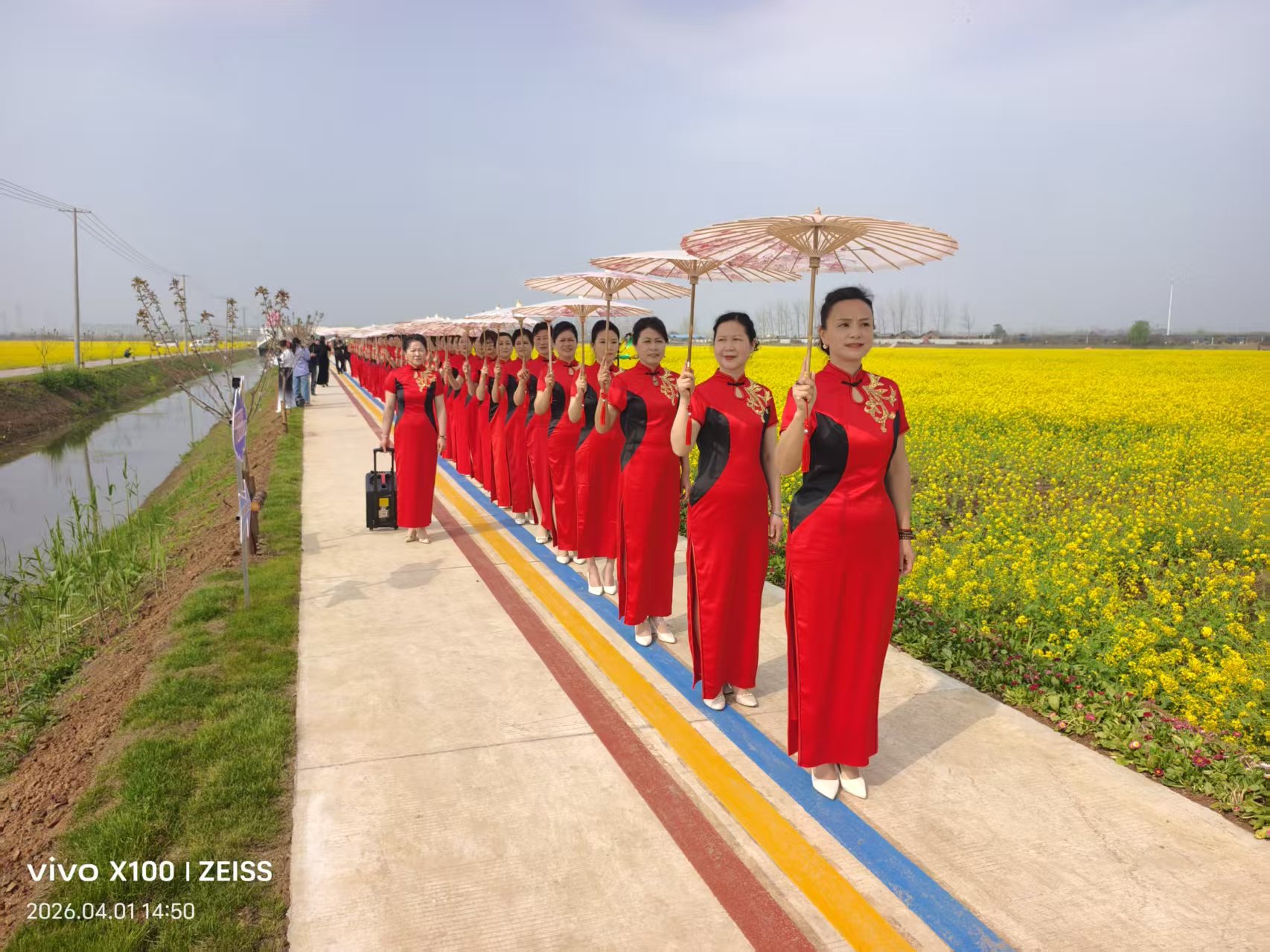 舞台之上,春日盛宴的精彩轮番上演。身着蓝白舞衣的舞者手持折扇,以灵动舞姿演绎江南温婉;另一组演员身着红装,伴随铿锵鼓点奏响《毗邻人家醉春光》的欢快旋律,鼓乐齐鸣间尽显民俗韵味。更有身着红旗袍、手持油纸伞的阿姨们列队走过花田,优雅的步态与明艳的色彩相映,成为花海中一道靓丽风景线,将东方女性的温婉与乡土文化的醇厚展现得淋漓尽致。