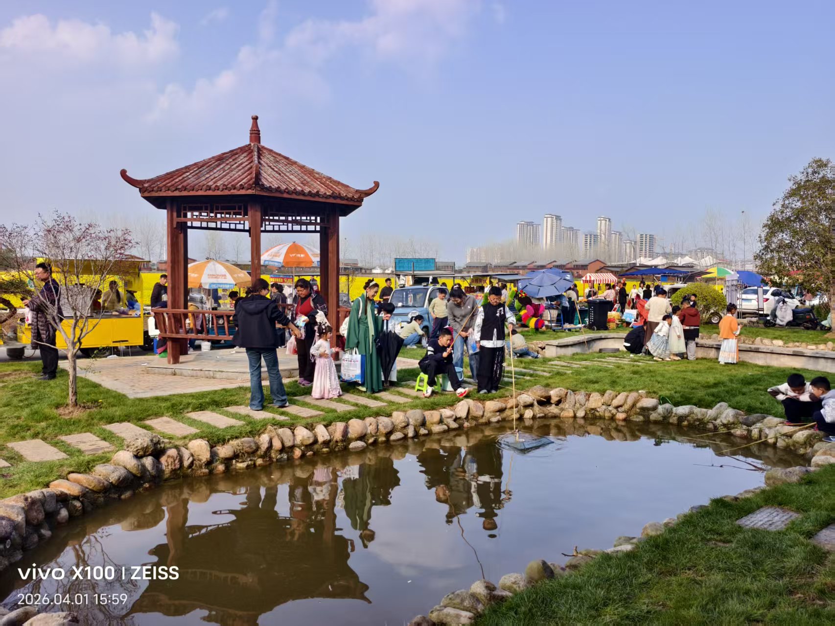活动现场,千亩油菜花田迎着暖阳肆意盛放,金黄的花浪连绵不绝,与澄澈蓝天、碧绿草地相映成趣。巨型黄色花朵造型装置点缀其间,成为游客打卡的热门背景。田埂间、花丛旁,游客们或漫步赏景,或驻足拍照,孩子们拿着渔网在水边嬉戏,欢声笑语回荡在花海之上。远处白墙红瓦的民居与林立的高楼相映,乡村田园的静谧与城镇发展的活力交融,勾勒出汊河宜居宜游的独特风貌。