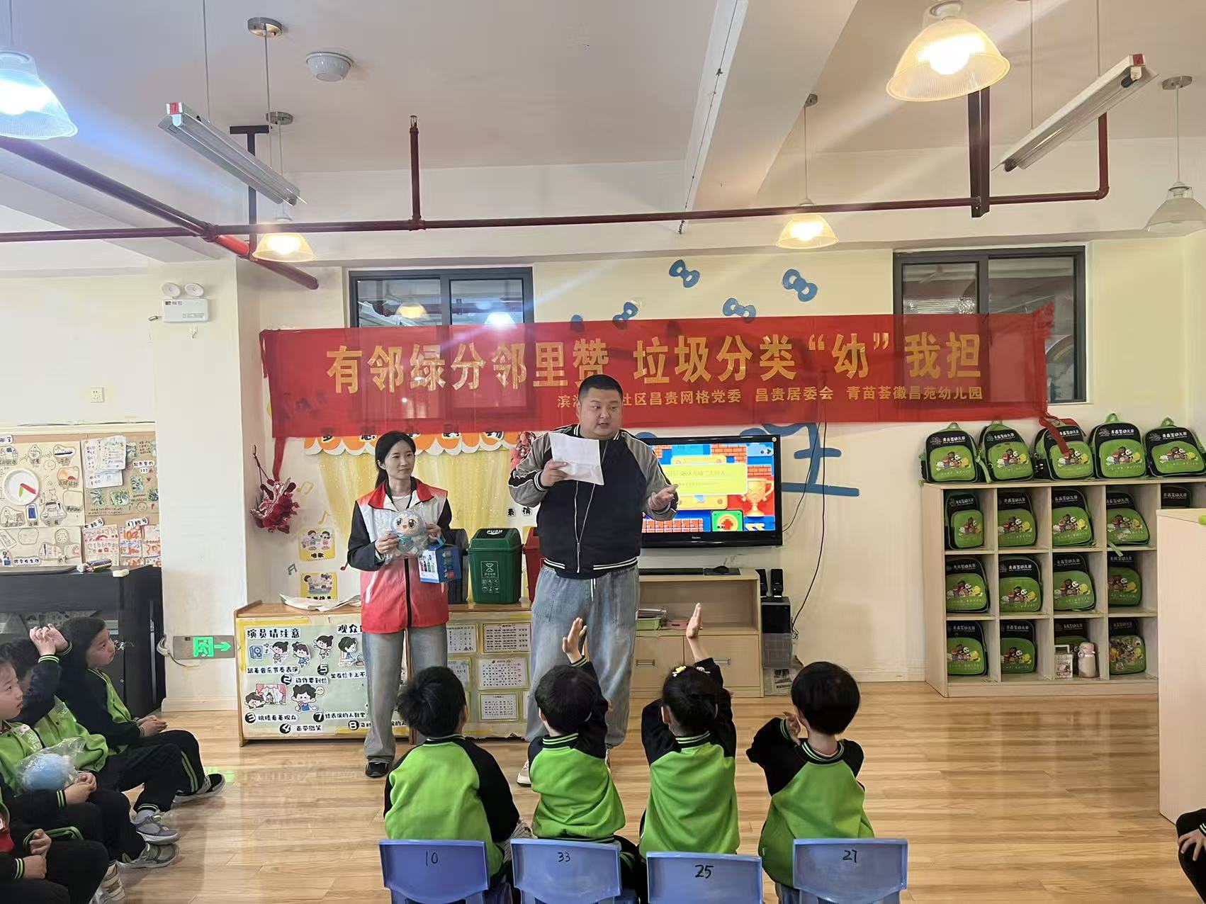 与此同时,绿色新风也吹进了校园,在青苗荟徽昌苑幼儿园,由城管部门联合昌贵居委会开展的“‘有邻绿分’邻里赞,垃圾分类‘幼’我担”主题宣传活动也在火热进行中。工作人员结合幼儿认知特点,用通俗易懂的语言、趣味互动游戏,科普垃圾分类基础知识,引导孩子们认识四色垃圾桶的“专属职责”,随后,孩子们化身“环保小画家”,用五彩画笔描绘垃圾分类愿景,勾勒绿色家园梦想。“科普 + 绘画”这种寓教于乐的形式,让孩子们在轻松氛围中学习环保知识,在幼小心田播撒下“垃圾分类从小做起”的文明种子。